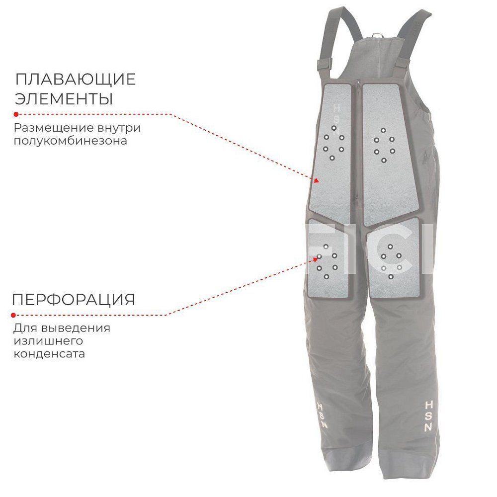 Низ полукомбинезона усилен дополнительно прочной термоустойчивой пленкой Protectfilm австрийского производства. Также изнутри полукомбинезон имеет перфорацию на подкладочной ткани для быстрого вытекания воды.